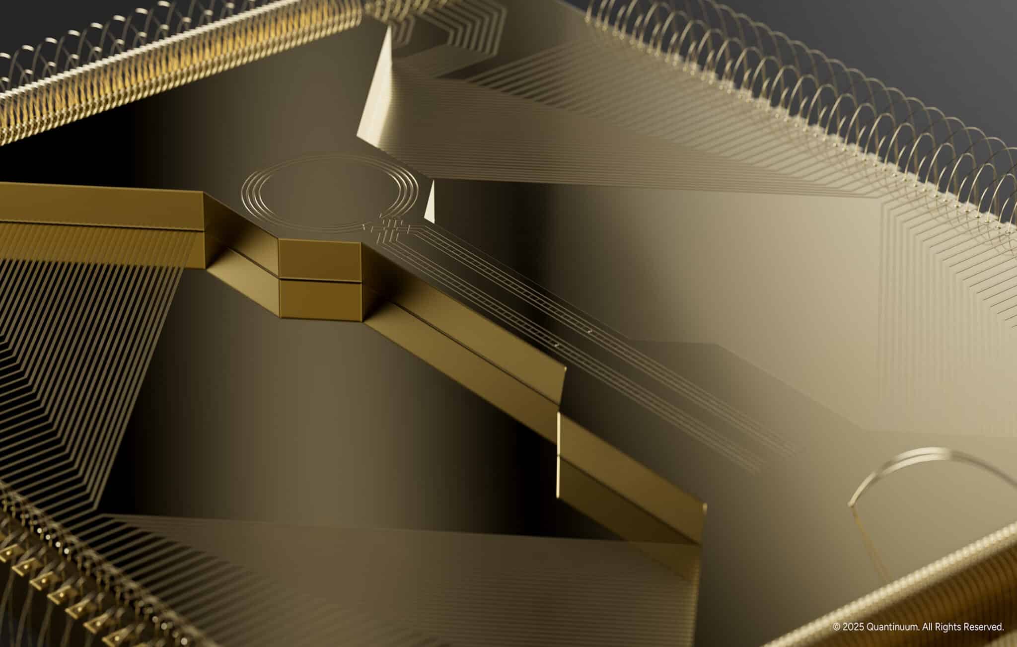 Another key architectural advance is the junction ion trap itself. Helios’s trap features a rotatable ion storage ring connected to upper and lower linear “legs” via an X-junction. Qubits are loaded and swapped between the ring (which acts as a random-access memory) and the linear segments (which feed into logic zones). This junction allows efficient routing of ions without increasing control wiring complexity, paving the way to maintaining full connectivity even as qubit counts grow.