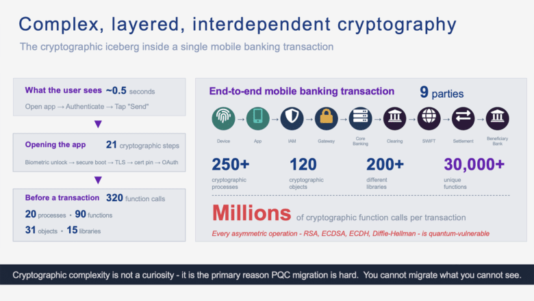 A single mobile banking payment triggers millions of cryptographic function calls across nine parties. Here's what actually happens - from silicon to settlement - and why it matters for quantum readiness. The Cryptographic Iceberg Inside a Mobile Banking Transaction 320 function calls before you even type an amount It takes roughly half a second. You press your thumb against the sensor, your banking app opens,…