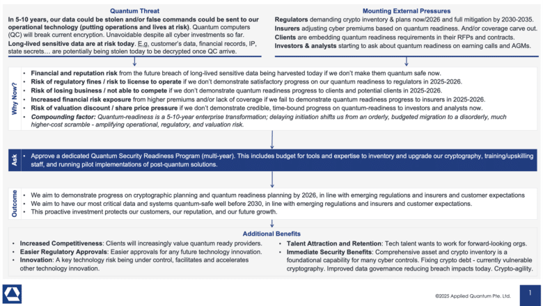 My company - Applied Quantum - helps governments, enterprises, and investors prepare for both the upside and the risk of quantum technologies. We deliver concise board and investor briefings; demystify quantum computing, sensing, and communications; craft national and corporate strategies to capture advantage; and turn plans into delivery. We help you mitigate the quantum risk by executing crypto‑inventory, crypto‑agility implementation, PQC migration, and broader defenses against the quantum threat. We run vendor due diligence, proof‑of‑value pilots, standards and policy alignment, workforce training, and procurement support, then oversee implementation across your organization. Contact me if you want help.