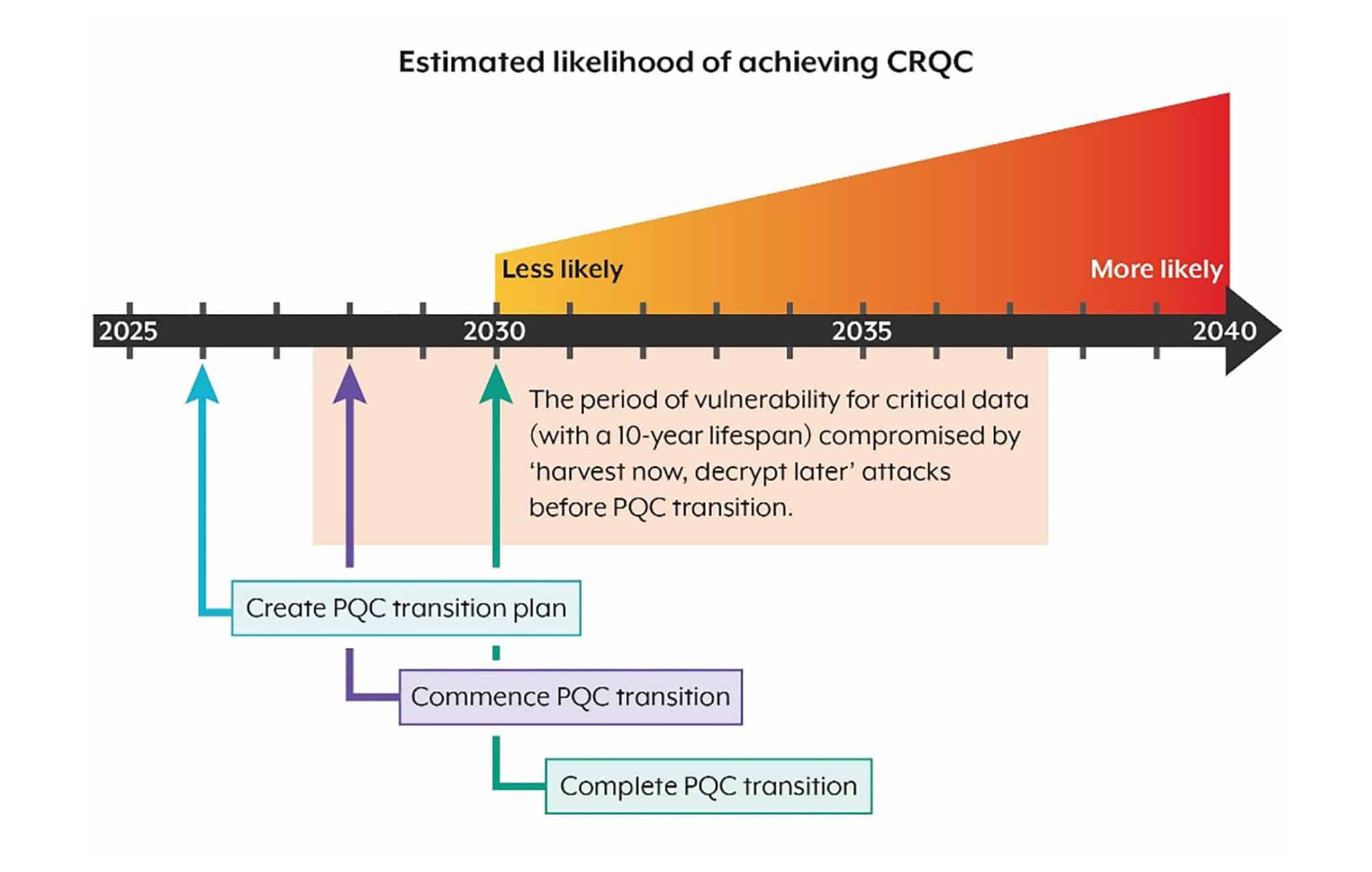 ASD’s recommended PQC transition timeline (in blue/purple/green) plotted against the rising likelihood of a powerful quantum computer by year. The goal is to finish migrating to post-quantum cryptography by 2030, before quantum attacks become a serious risk.