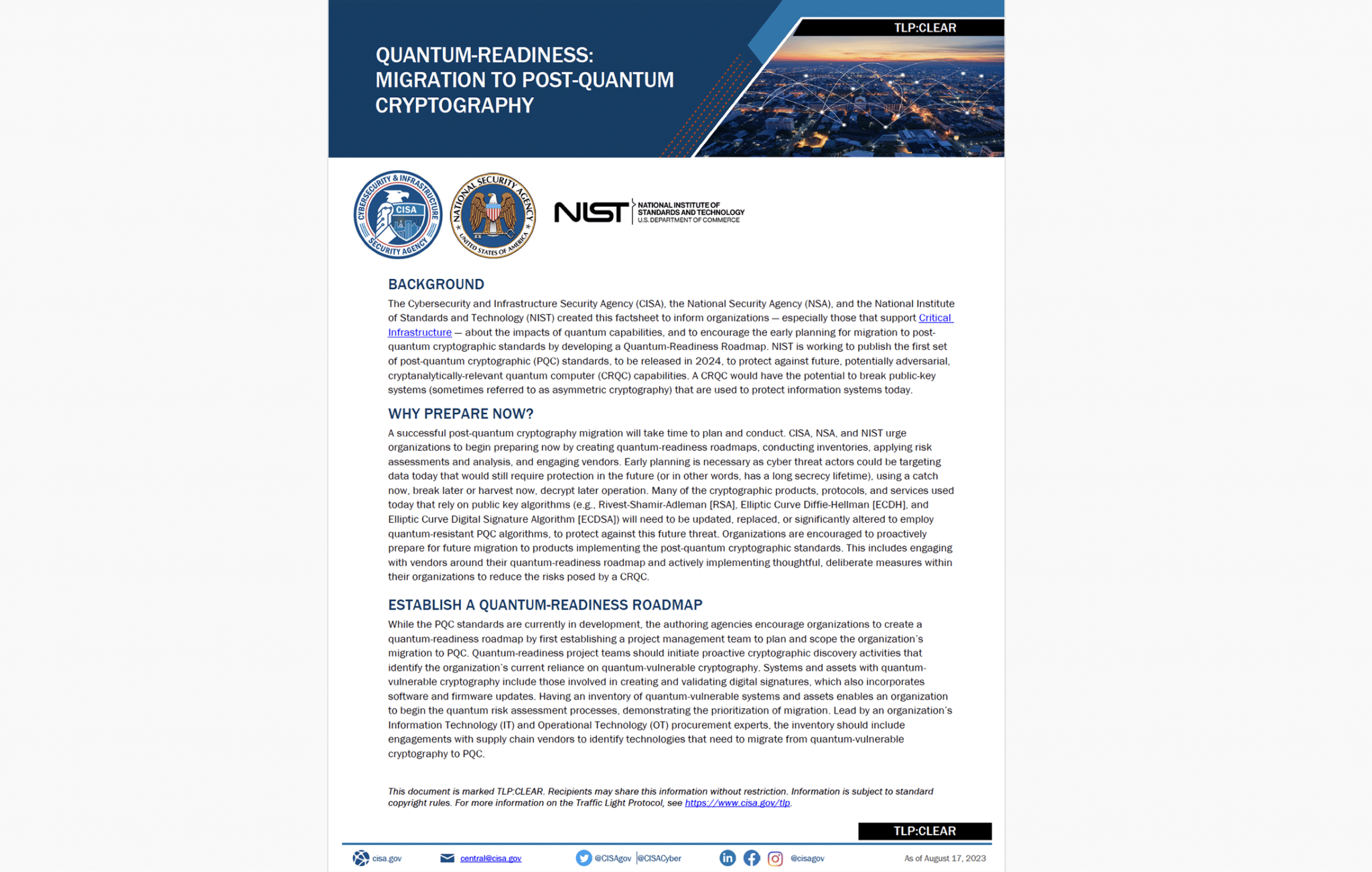 22 Aug 2023 – The Cybersecurity and Infrastructure Security Agency (CISA) together with the NSA and NIST released a joint cybersecurity factsheet titled “Quantum-Readiness: Migration to Post-Quantum Cryptography.” This document was created to inform organizations – “especially those that support Critical Infrastructure” – about the looming impact of quantum computing on today’s encryption, and to “encourage the early planning for migration to post-quantum cryptographic standards by developing a Quantum-Readiness Roadmap”.