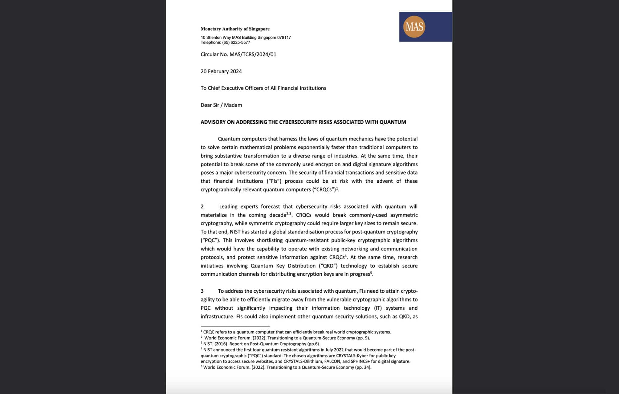 Monetary Authority of Singapore (MAS) Quantum Risk Advisory