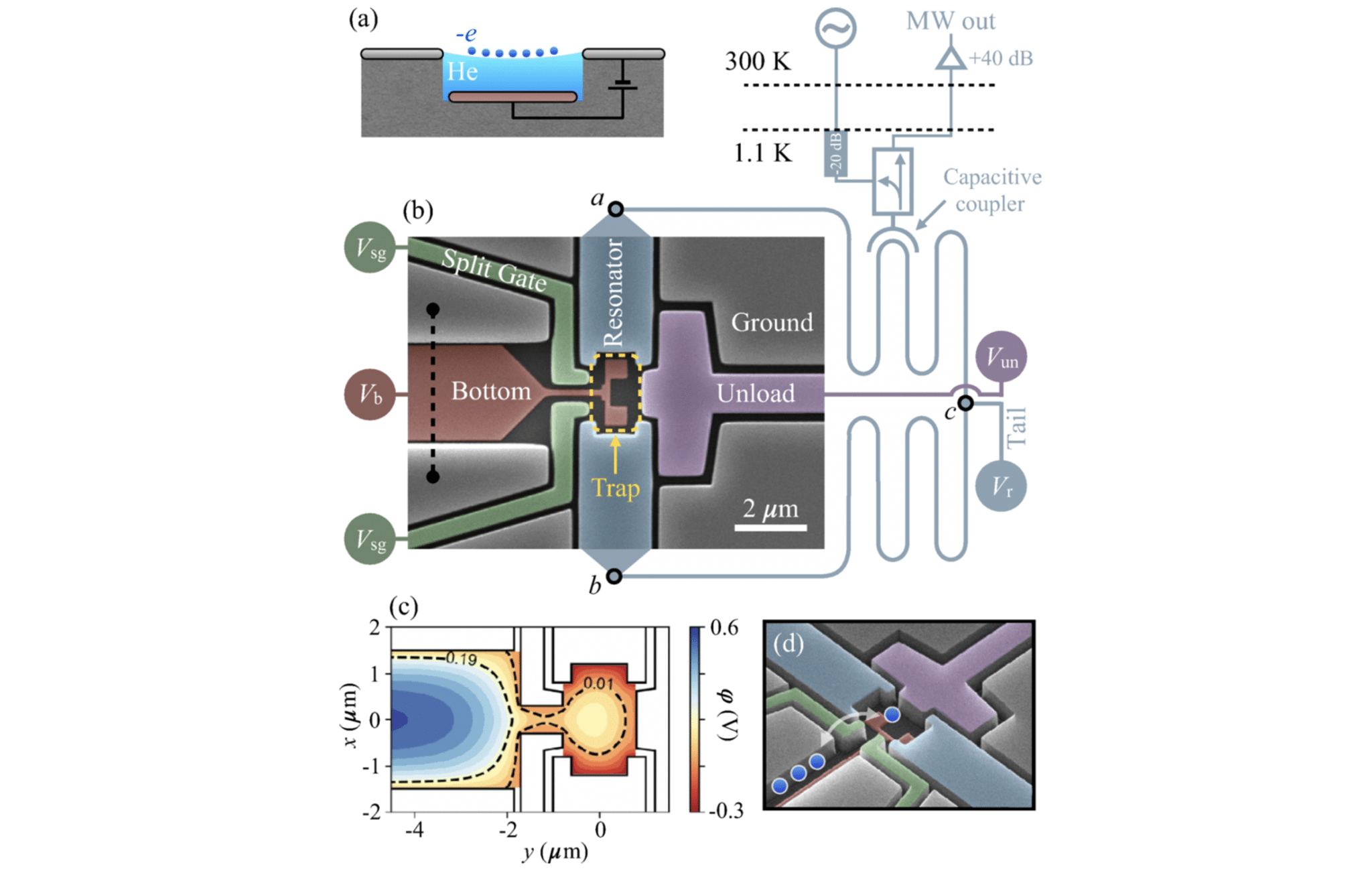 At the heart of EeroQ’s approach is a novel qubit design: single electrons floating on a thin film of superfluid helium, held in place by micro-fabricated electrodes on a chip. This platform leverages one of the purest possible environments in physics – a vacuum-like interface between the electron and helium – which minimizes disruptions to the electron’s quantum state. In the new experiment, the team patterned tiny niobium electrodes to form narrow helium-filled microchannels with an isolated trap region connected to an electron reservoir. By tuning electrode gate voltages, they could load single electrons into the trap or remove them on demand. The trapped electron interacts with a coplanar waveguide microwave resonator integrated on the chip, which acts as a sensitive monitor of the electron’s presence and motion. As electrons were added one by one, the resonator’s frequency shifted measurably – allowing the researchers to detect even a single electron “dancing” on the helium in real time.