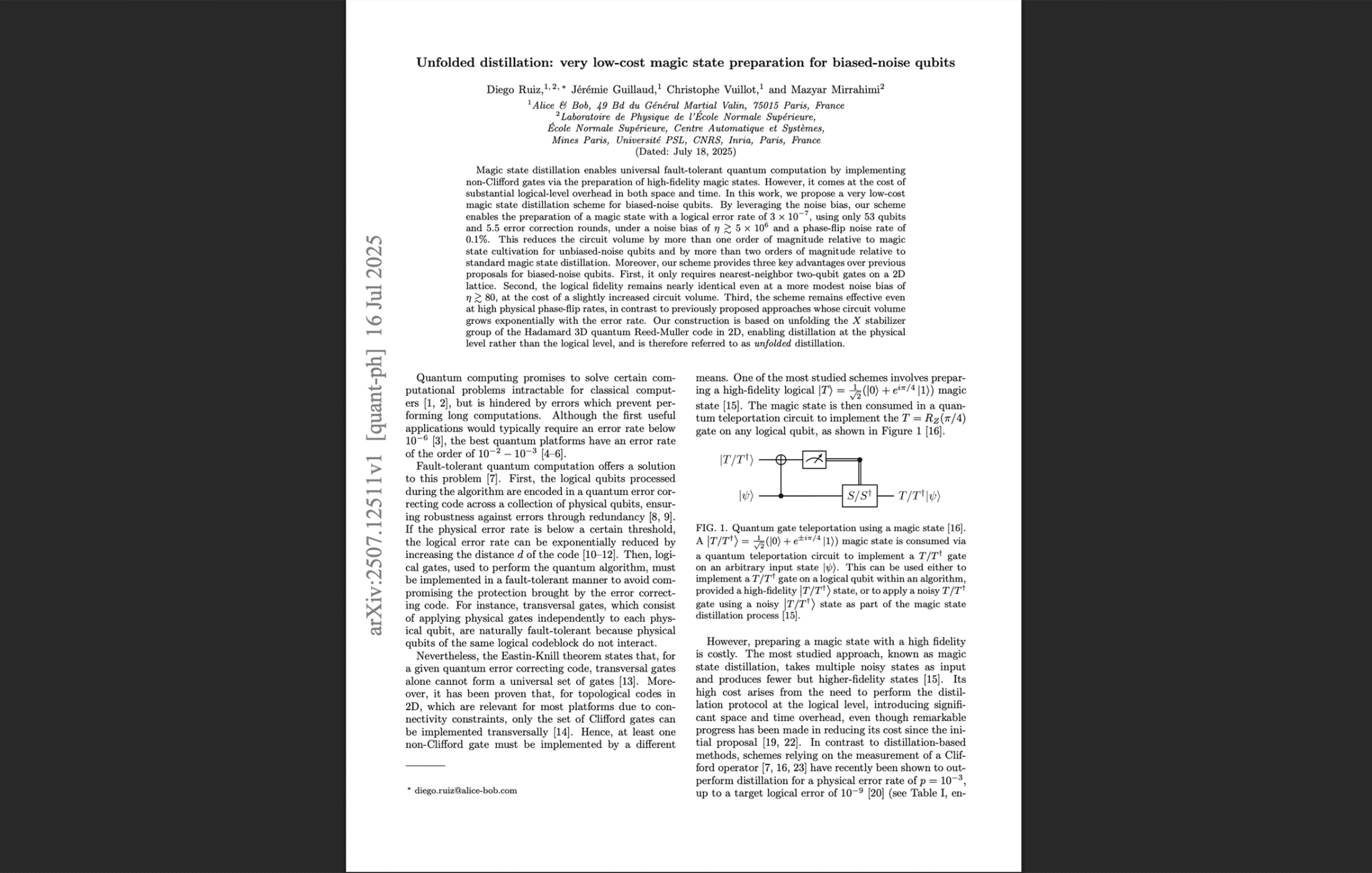 August 2025 – A new research paper from quantum startup Alice & Bob in collaboration with Inria unveils a technique to significantly reduce the cost of magic state generation – a crucial resource for universal fault-tolerant quantum computing. The paper, titled “Unfolded distillation: very low-cost magic state preparation for biased-noise qubits”, describes an error-correction scheme dubbed the “unfolded code” that leverages the unique properties of noise-biased cat qubits. By exploiting the naturally high bias of cat qubits against bit-flip errors, the researchers “unfold” a complex 3D distillation code into a simpler 2D layout.