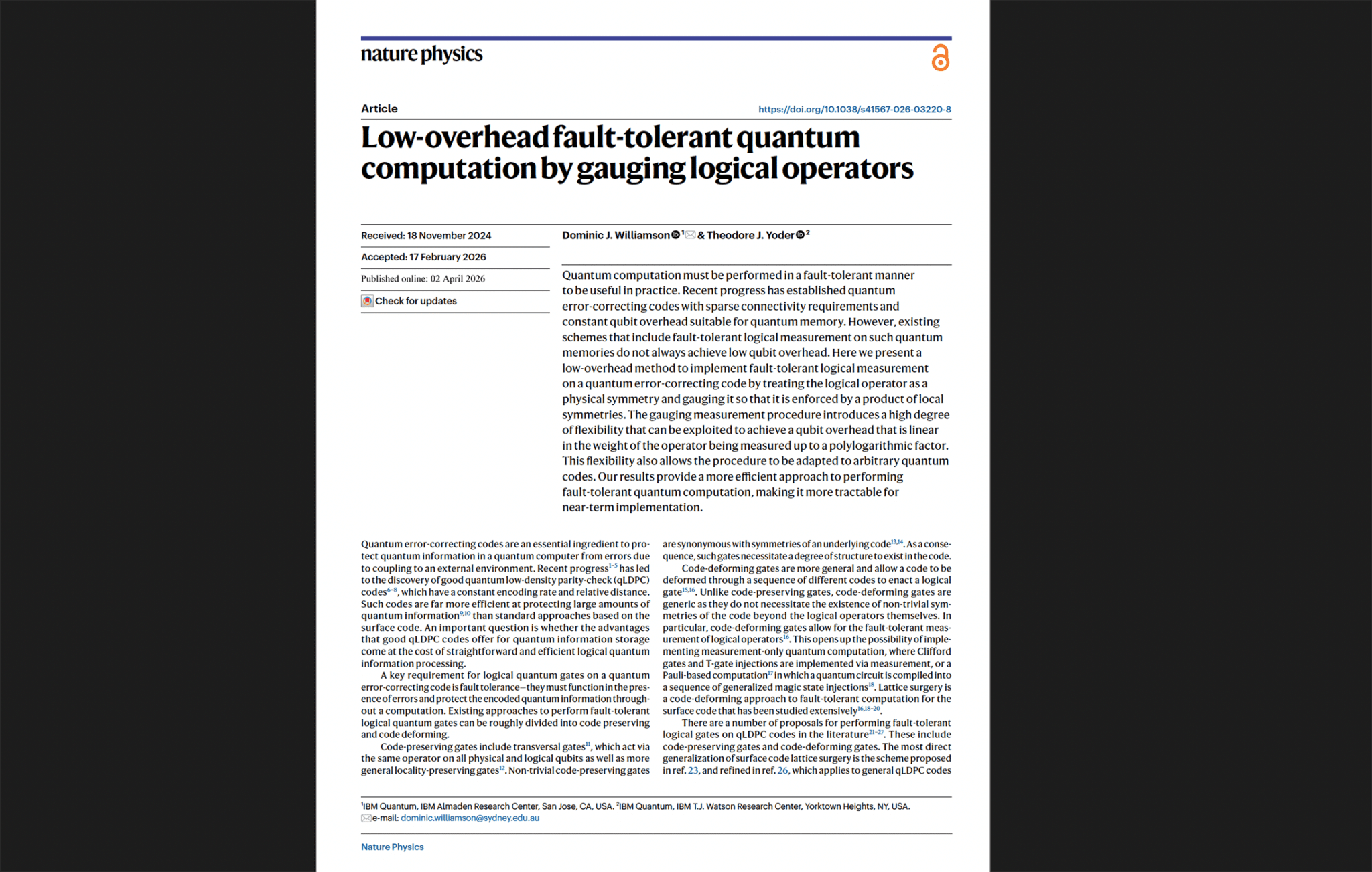 April 2, 2026 – Dr. Dominic Williamson of the University of Sydney and Theodore Yoder of IBM have published a new method for performing fault-tolerant logical measurements on quantum error-correcting codes that dramatically reduces the physical qubit overhead required. The paper, titled “Low-overhead fault-tolerant quantum computation by gauging logical operators”, appears in Nature Physics (DOI: 10.1038/s41567-026-03220-8).