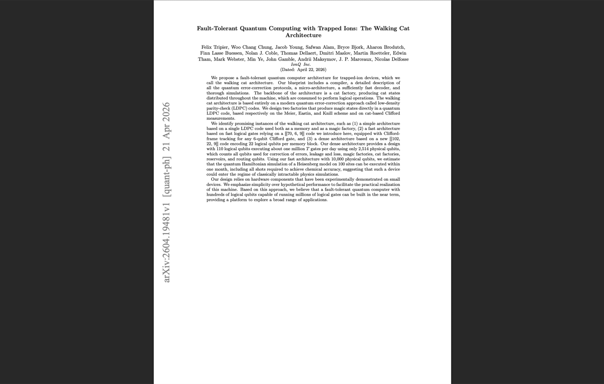 22 Apr 2026 — IonQ has published a 110-page preprint detailing what it calls the “walking cat architecture”: a complete, end-to-end blueprint for a fault-tolerant quantum computer (FTQC) built on trapped ions. The paper, titled “Fault-Tolerant Quantum Computing with Trapped Ions: The Walking Cat Architecture,” was posted to arXiv on April 21, 2026, with 18 authors, all from IonQ.