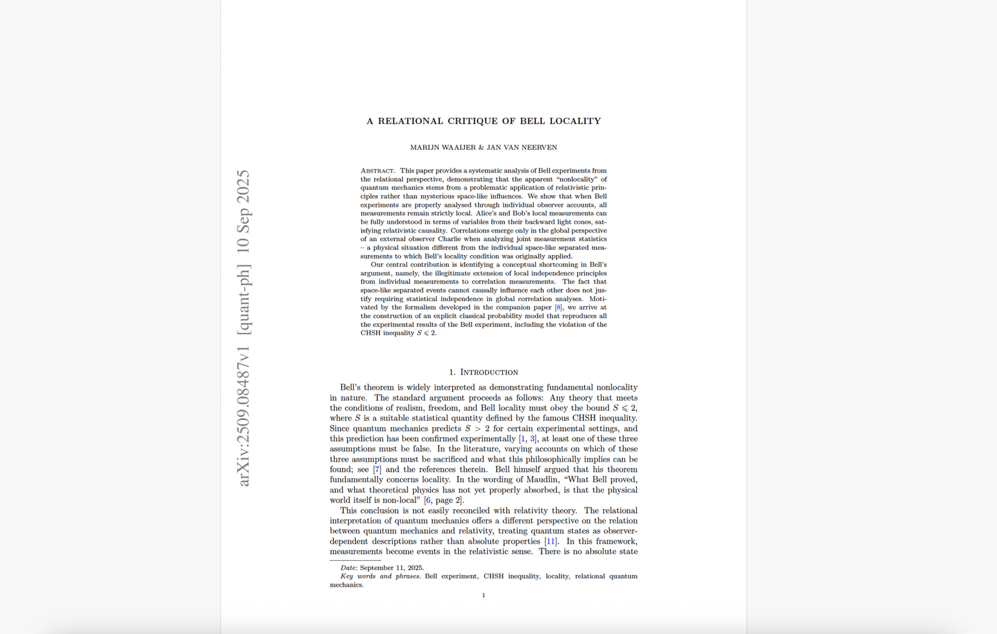 Sep 2025 – I usually highlight papers with clear practical implications for quantum computing and quantum security. Every so often, though, a foundational paper is intriguing enough to warrant attention – this one struck me that way, and I think it may interest you too. Just a few days ago Waaijer and van Neerven published a paper “A Relational Critique of Bell Locality” in which they analyze Bell experiments through the lens of relational quantum mechanics (RQM).